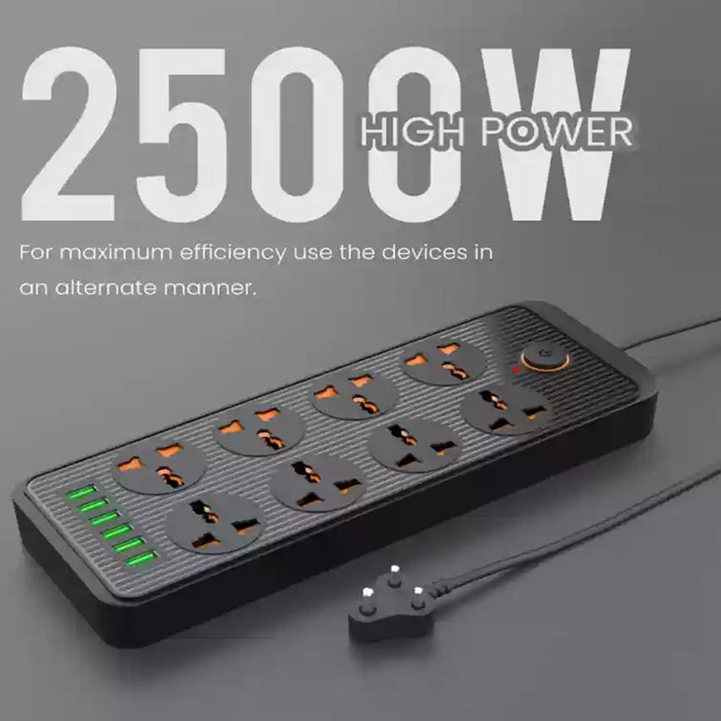 Portronics Power Plate 7 with 6 USB Port + 8 Power Sockets Smart Electric Universal Extension Board Multi Plug with 2500W, 3Mtr Cord Length, 2.1A USB Output(Black), 250 Volts