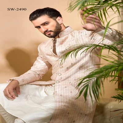 Size 38(S) 40(M) 42(L) 44(XL) Price Include:-Sherwani,Kurta,Payjama,Jutti Light peach raw silk sherwani with self tone all over verticle embroidery worn with cotton silk kurta and churidar